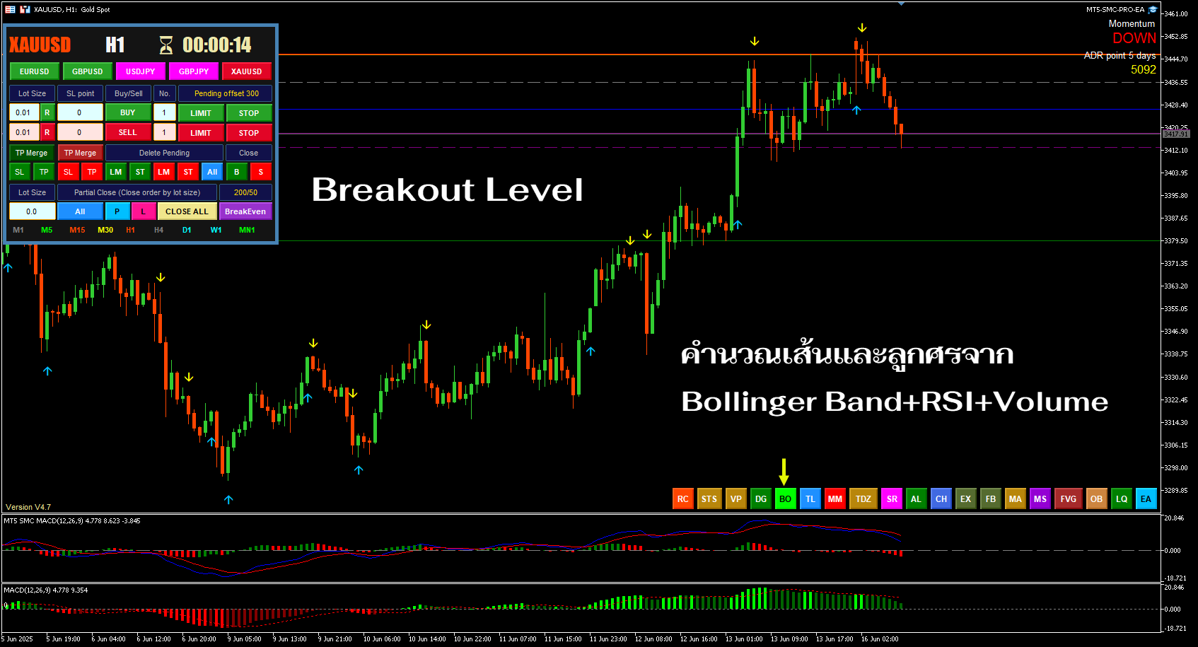 BO หรือ BreakOut เป็นเครื่องมือที่แสดงจุดที่ราคามีการ Breakout ออกจากบริเวณต่างๆ โดยเครื่องมือนี้ได้ใช้การคำนวณจากสัญญาณสามตัวคือ Bollinger Band และ RSI และ Volume เพื่อใช้คาดการณ์ทิศทางของราคาระยะสั้น สำหรับการเทรดที่มีคุณภาพไม่ควรใช้เครื่องมือใดเครื่องมือหนึ่งเพียงตัวเดียว ควรใช้เครื่องมือหลัก เช่น โครงสร้างราคา ตามด้วยโซนราคา และ หาการกลับตัว หรือ การ Breakout อย่างน้อยๆควรมี 3 เงื่อนไขในการเทรดตัวอย่างเช่น โครงสร้างราคาเห็นชัดเจนว่าเป็นขาลง เราก็ต้องโฟกัสที่ Supply zone หรือ โซนแนวต้าน เมื่อราคาไปถึงบริเวณ โซนแนวต้านก็ใช้สัญญาณยืนยันการกลับตัว หรือ ในกรณีที่โครงสร้างตลาดเป็นขาลง ราคาลงมาที่ Demand zone และเกิดสัญญาณ Breakout เราก็รอก่อน เมื่อราคาทะลุ Demand zone ลงมาได้ ต่อมาราคาย้อนขึ้นไปหา Demamd zone เดิม ที่ปัจจุบันเปลี่ยนหน้าที่ไปเป็น Supply zone ไปแล้วเราก็ค่อยเข้าเทรดที่ Supply zone ล่าสุดยังมีระบบแจ้งเตือนเมื่อราคาวิ่งชนเส้นแนวนอน หรือ แจ้งเตือนเมื่อเกิดสัญญาณลูกศร