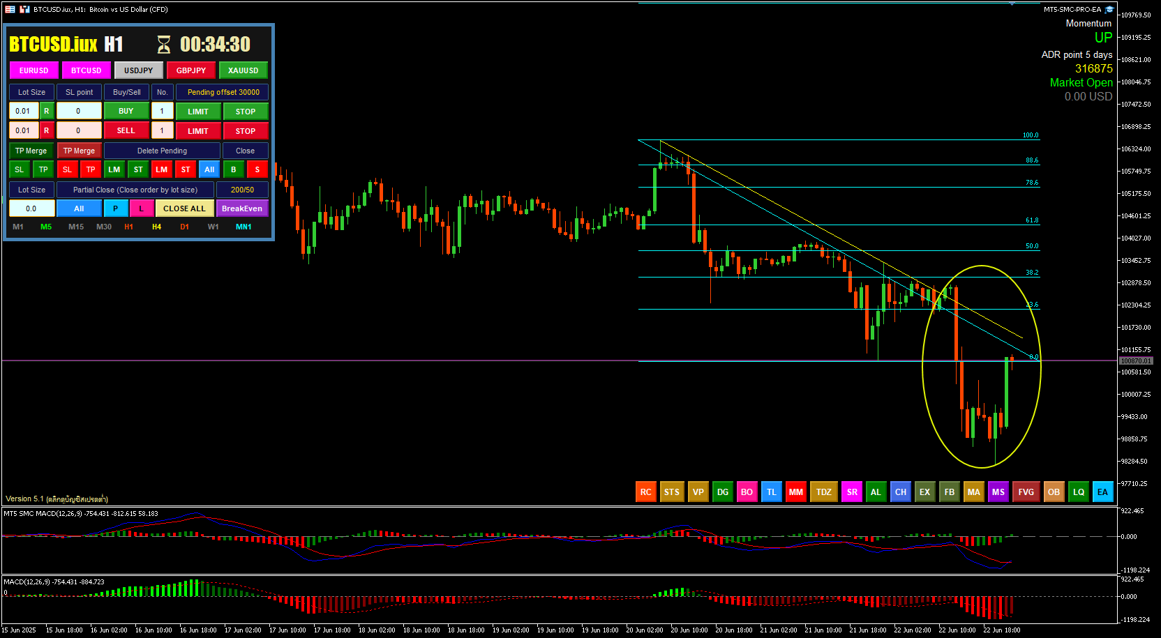 หลังจากรอ 6 ชั่วโมงต่อมาก็เกิดเหตุการณ์ สหรัฐฯโจมตีแหล่งนิวเคลียร์ในอิหร่าน ทำให้เกิดความไม่แน่นอนทั่วโลก นักลงทุนรีบลดการถือสินทรัพย์ความเสี่ยงสูง กลายเป็นแรงขายบิตคอยน์อย่างรวดเร็ว ตลาดสินทรัพย์เสี่ยงทั่วโลกก็ปรับตัวลงเช่นกัน สะท้อนภาพ "risk-off" ชัดเจน Risk-off คือสถานการณ์ในตลาดการเงินที่นักลงทุน "หลีกเลี่ยงความเสี่ยง" โดยรีบถอนเงินออกจากสินทรัพย์ที่มีความผันผวนสูง (เช่น หุ้น, คริปโต, สินทรัพย์เก็งกำไร) แล้วเปลี่ยนไปถือ สินทรัพย์ปลอดภัย (Safe Haven) เช่น ทองคำ เป็นต้น