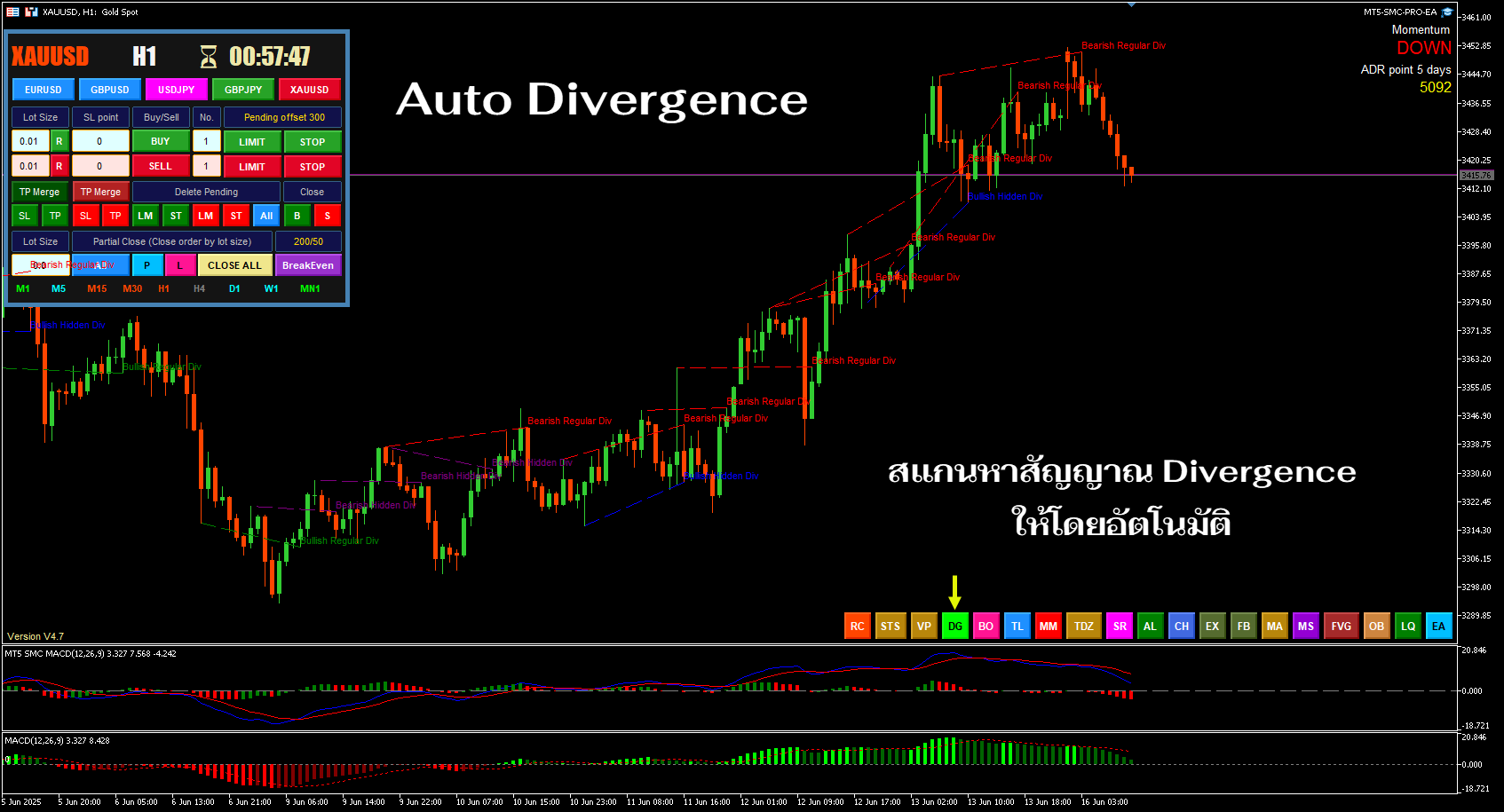 DG หรือ Divergence เครื่องมือนี้จะทำการสแกนหาบริเวณที่เกิดสัญญาณ Divergence ในรูปแบบต่างๆ ทั้ง Regular และ Hidden ค่ามาตรฐานกำหนดให้แสดงเฉพาะ Regulat Divergence เท่านั้น เพื่อจะได้ดูง่าย ไม่รกหน้าจอ สัญญาณ Divergence ก็คือการสะท้อนให้เห็นพฤติกรรมบางช่วงของตลาด ที่ราคาวิ่งไปทางหนึ่ง แต่สัญญาณอินดิเคเตอร์กลับวิ่งสวนทางไปอีกทาง และ ต่อมาราคามักจะวิ่งไปตามทิศทางของอินดิเคเตอร์ ซึ่งเป็นรูปแบบของ Regullar Divergence ที่มักเกิดในช่วงท้ายเทรนด์ หรือ ใกล้จบเทรนด์