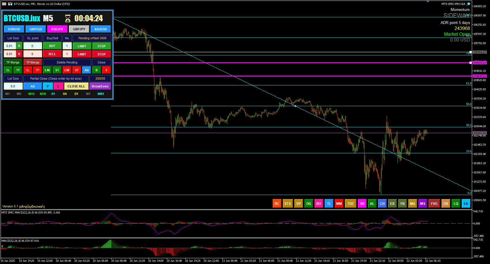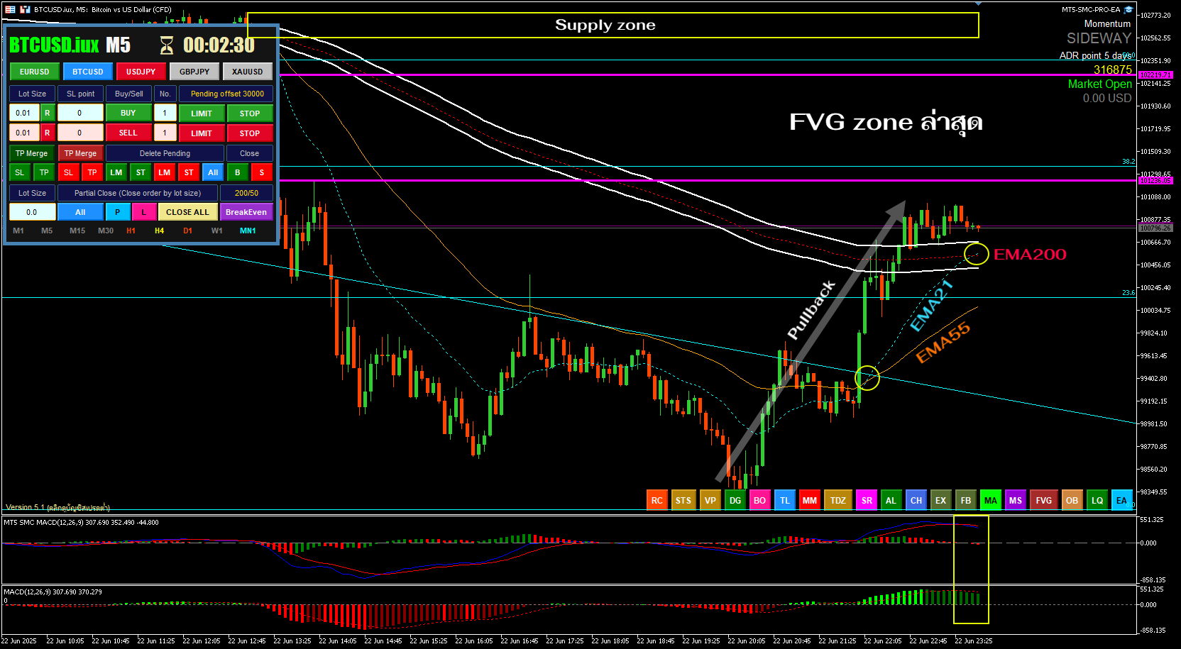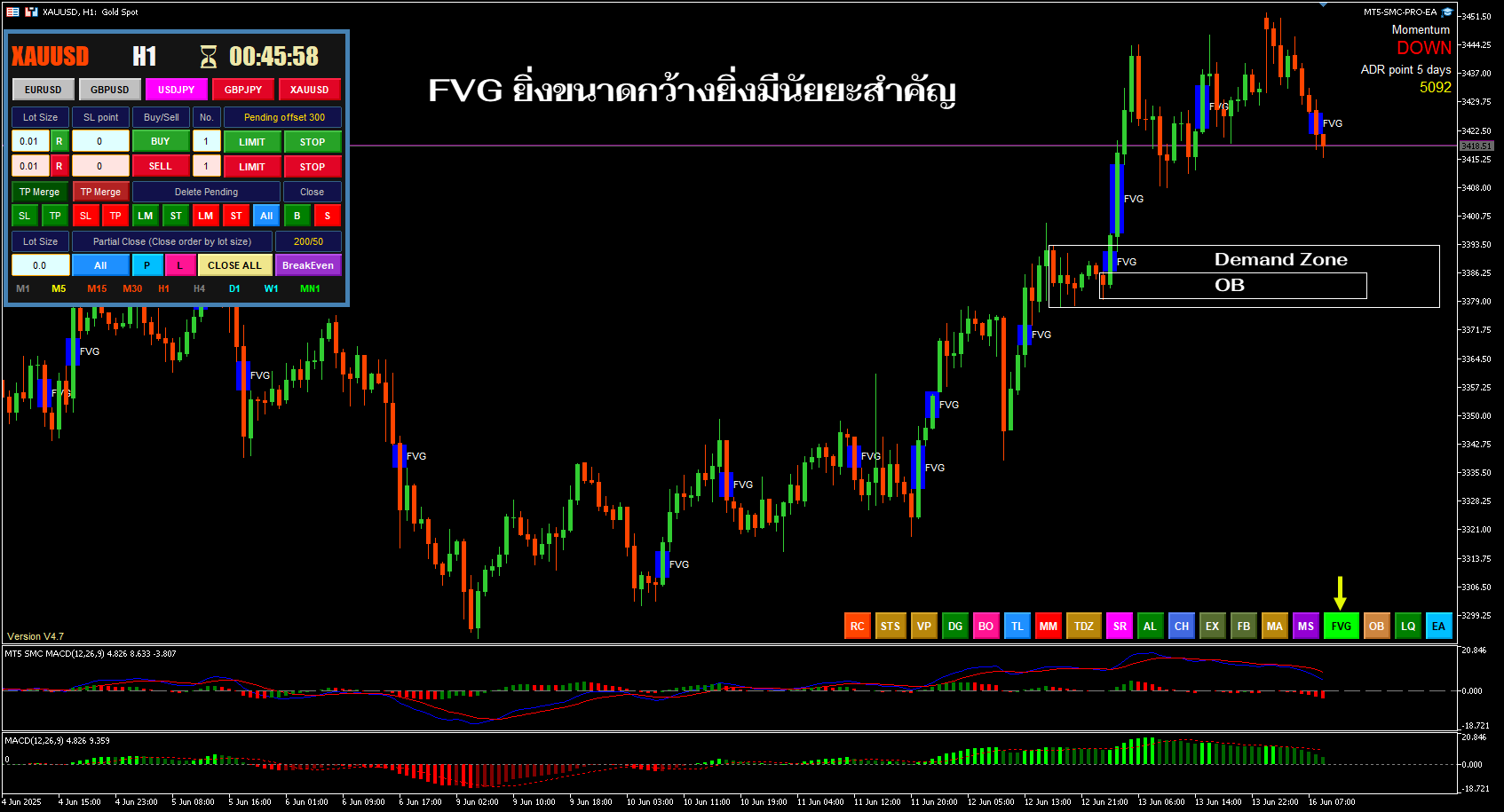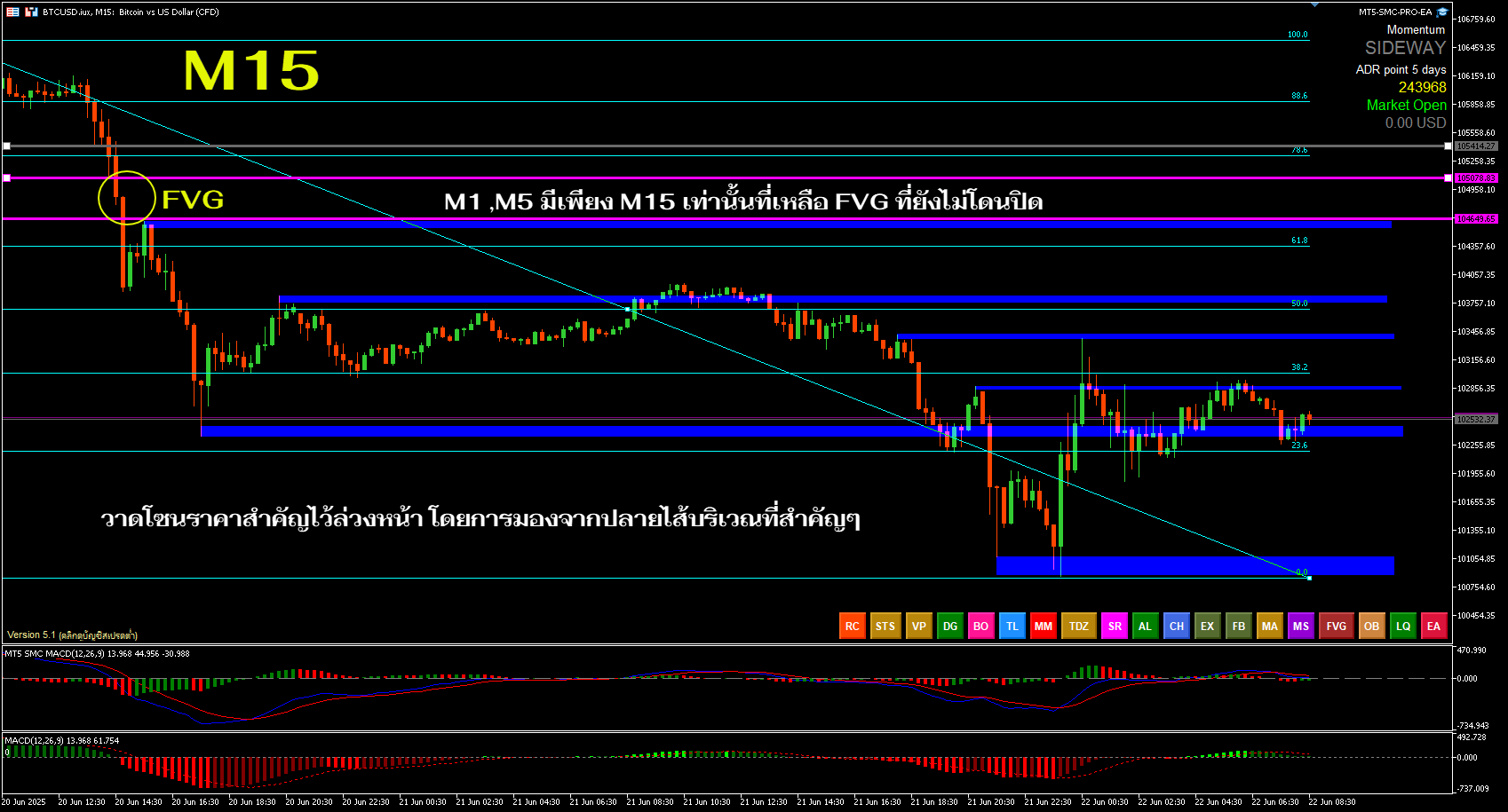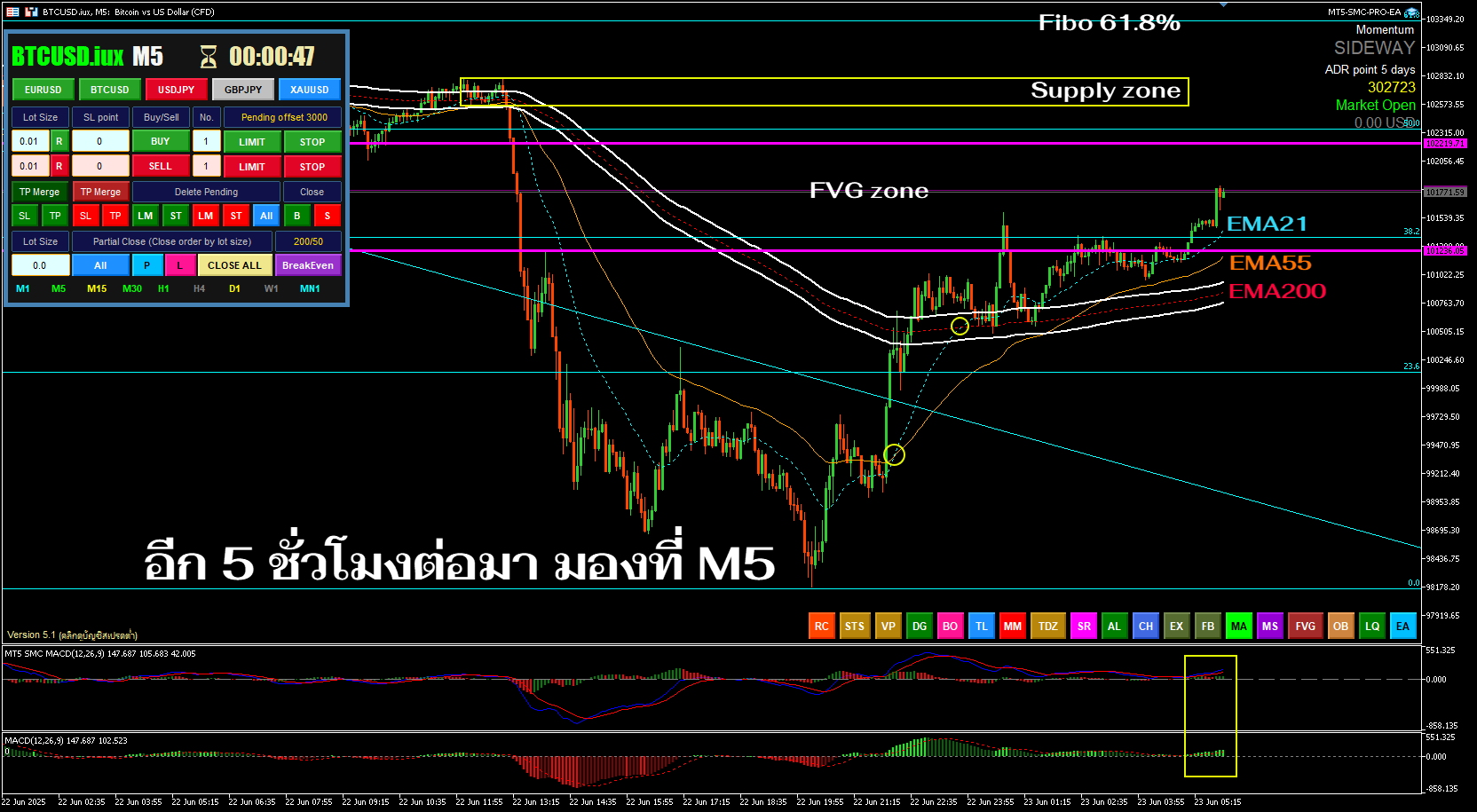 ภาพล่างนี้อัพเดทอีก 5 ชั่วโมงต่อมา มองที่ไทม์เฟรม M5 ราคาได้เข้ามาใน FVG zone ล่าสุดแล้ว หากดูที่ MACD จะเห็นว่าโมเมนตัมขาขึ้นยังแรงต่อเนื่อง ยังไม่แสดงการสิ้นสุดของสถานนะ Pullback ก็รอต่อไป การรอคอยคือเทคนิคที่สำคัญอย่างหนึ่งของการเทรดเชิงคุณภาพ