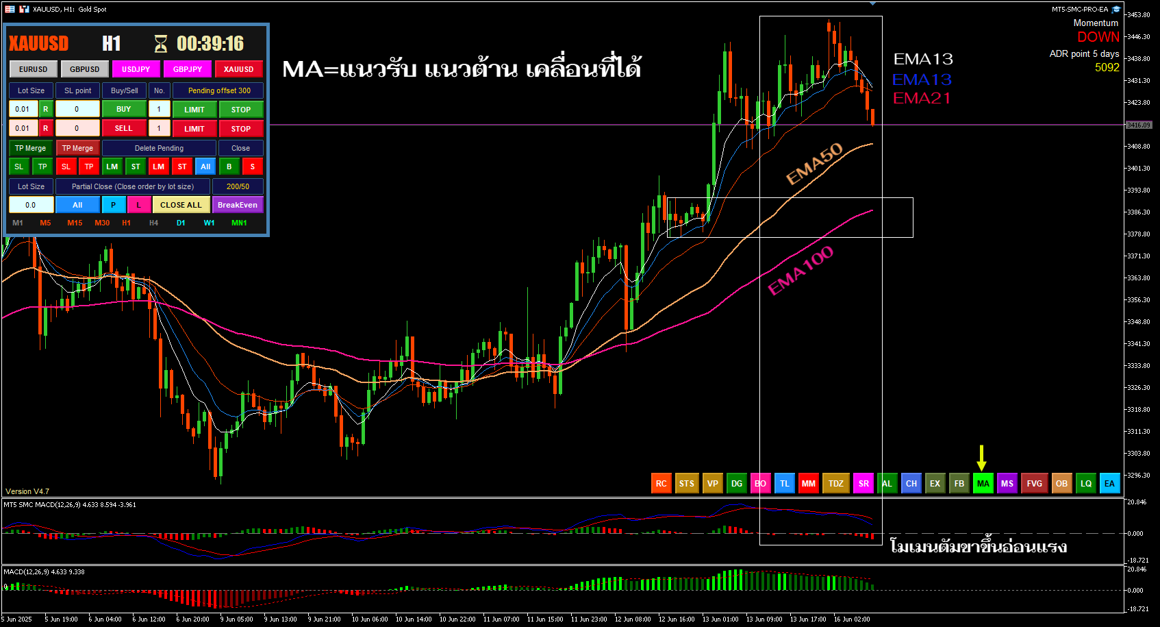 📌 การเทรดที่ดีต้องวิเคราะห์คาดการณ์ทิศทางล่วงหน้า และ วิเคราะห์ตามสถานการณ์หน้างานควบคู่กันไปด้วย หากทิศทางไปตามการวิเคราะห์ล่วงหน้า ก็ถือว่ามีเหตุผลรองรับการเข้าเทรดเบื้องต้นแล้ว จากนั้นก็รอสัญญาณยืนยันความชัดเจนของสถานการณ์หน้างาน เช่น ตำแหน่งของแท่งเทียนกับ โซนราคาสำคัญ และ การยืนยันจากสัญญาณเส้นค่าเฉลี่ย และ ทิศทางของโมเมนตัมจาก MACD (Zone+Trend+Pullback+Momentum)