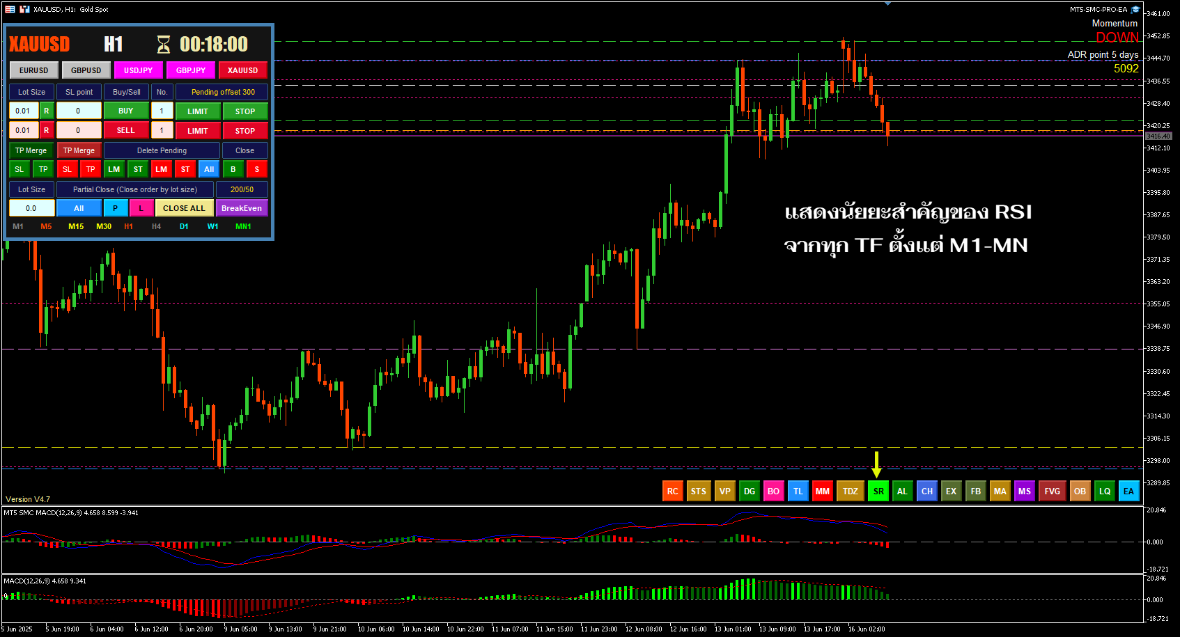 SR ย่อมาจากคำว่า Support Resistance ก็คือแนวรับ และ แนวต้าน นั้นเองโดยเครื่องมือนี้จะทำการสแกนหาระดับราคาที่มีการทดสอบหลายๆครั้งหรือเกิดนัยยะทางราคาซ้ำๆ จากทุกไทม์เฟรม ตั้งแต่ M1 จนถึง MN นำมาแสดงที่หน้าจอเดียวทำให้สะดวกในการใช้งาน และ ยังมีการคำนวณหาแนวรับ แนวต้าน จาก RSI อีกด้วย