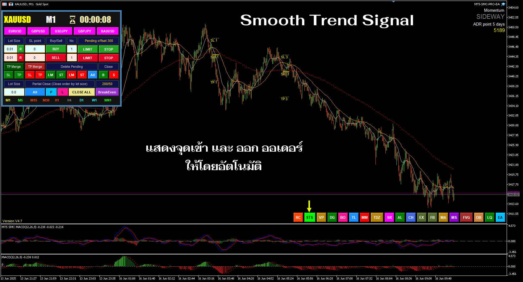 STS ย่อมาจาก Smooth Trend Signal ดูผิวเผินก็จะคล้ายๆเส้นค่าเฉลี่ยเคลื่อนที่ แต่กลไกการแสดงเส้นสัญญาณทั้งสองนั้นไม่ได้คำนวณแบบเส้นค่าเฉลี่ย แต่ใช้การใช้สูตรอ้างอิงพฤติกรรมของตลาดช่วงปัจจุบันเป็นหลักในการคำนวณเพื่อสร้างเส้นขึ้นมา และ ยังมีกลไกการกรองสัญญาณเพี้ยนออกไปทำให้เส้นวิ่ง ได้ราบเรียบลดการขยักเกี่ยวพันกันลงไปมากกว่าเส้นค่าเฉลี่ยทั่วไป และ ใช้การตัดกันของเส้นแสดงจุดเข้าซื้อ หริอ ขาย โดยใช้เส้นค่าเฉลี่ยมาเป็นตัวแบ่งเทรนด์ (เส้นประไข่ปลาสีชมพู) สัญญาณ STS นี้เหมาะสมสำหรับการเทรดสั้นในไทม์เฟรมเล็กๆ เช่น M1 หรือ M5 แต่ก็ควรอ้างอิงทิศทางหลักของ H1 ด้วย จะได้ไม่หลงเทรนด์ และ ควรเก็บกำไรระยะสั้นๆเท่านั้น เพื่อให้สัญญาณนี้มีความแม่นยำในการใช้งานก็ควรทำการปรับแต่งค่าให้เหมาะสมกับคู่เงินและไทม์เฟรมที่ใช้งานจริงๆก่อน เพราะค่าที่กำหนดมานั้นเป็นเพียงค่าเฉลี่ยกลางๆเท่านั้น✨ สำหรับระยะ SL และ TP ควรกำหนดเองตามความเสี่ยงที่รับได้จะดีที่สุด เพราะบางครั้งระบบจะคำนวณระยะ SL และ TP ที่แคบเกินไป