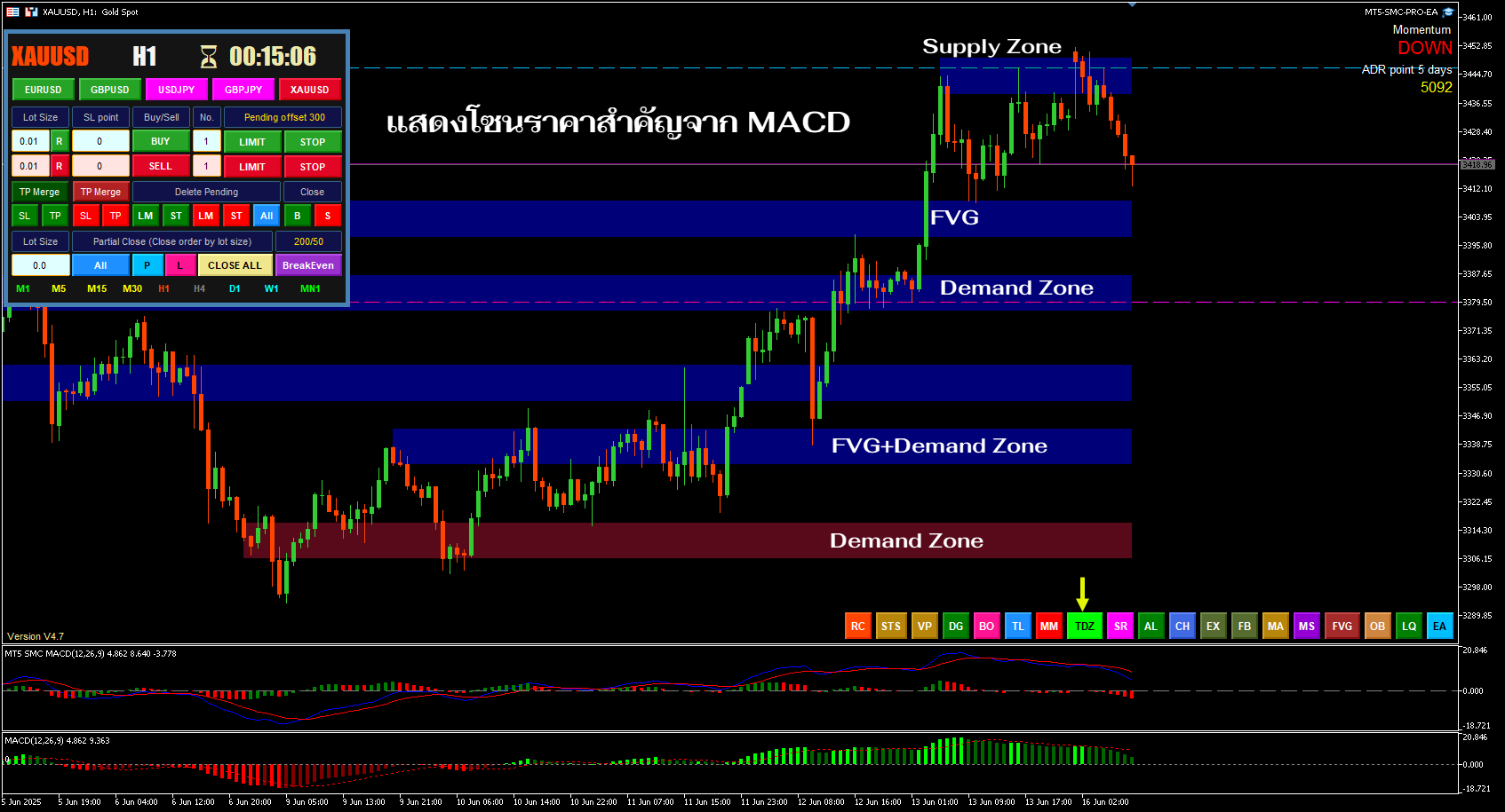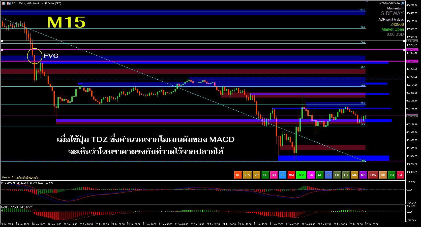 TDZ ย่อมาจากคำว่า Trading Zone โดยเครื่องมือนี้จะสร้างโซนราคาที่คำนวณจากโมเมนตัม โดยใช้ MACD ในการคำนวณเพื่อสร้างโซนราคาที่เกิดขึ้นกับสัญญาณที่เกิดนัยยะกับ MACD บ่อยๆ ทำให้การใช้งานง่ายกว่าการมองผ่านเครื่องมือ MACD โดยตรง หรือจะใช้ร่วมกันทั้งสองก็จะช่วยให้มีความแม่นยำมากยิ่งขึ้น จากภาพจะเห็นได้ว่าเมื่อโซนราคาถูกสร้างจาก MACD มันไม่ได้สร้างขึ้นมาแล้วไม่มีนัยยะ แต่มันเกิดนัยยะสำคัญที่เป็นทั้ง Demand & Supply และ FVG นั้นแสดงว่ากลไกการสร้างโซนราคาด้วย MACD นี้มันมีนัยยะสำคัญจริงๆ เป็นทางเลือกอีกวิธีหนึ่งที่สามารถนำมาอ้างอิงในการเทรดได้เป็นอย่างดี