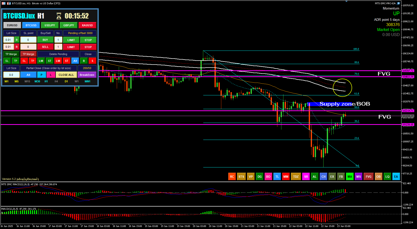 แม้ว่าสัญญาณ MACD ดูเหมือนจะปรับอ่อนแรงลงเล็กน้อย (เส้น MACD Signal ไม่น่าจะวิ่งตัด 0.0 ลงมาได้ด้วยซ้ำ) สถานการณ์เช่นนี้คาดว่าราคาจะย่อตัวลงมาเพียงเล็กน้อย และ จะดีดตัวขึ้นไปต่อในโซน FVG ซึ่งต้องรอดูสถานการณ์หน้างานอีกครั้งเมื่อราคาขึ้นไปถึง FVG zone