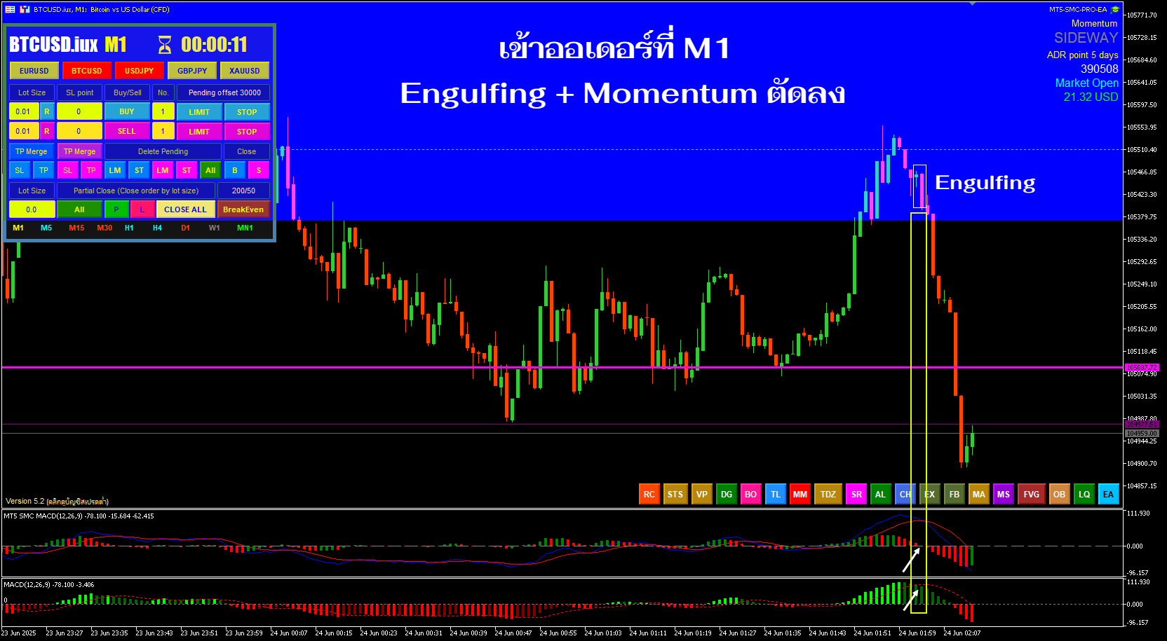 สัญญาณสิ้นสุดการ Pullback รอบแรกปรากฎที่ M1 โดยเกิด Engulfing Pattern จากนั้นรอให้สัญญาณโมเมนตัมของ MACD ทำการตัดลง เพื่อยืนยันแรงขาลงระยะสั้น จะเห็นได้ว่าทันทีที่เข้าออเดรอ์ Sell ราคาจะวิ่งลงทันที หากเก็บกำไรสั้นๆก็ถือว่าไม้นี้ชนะ