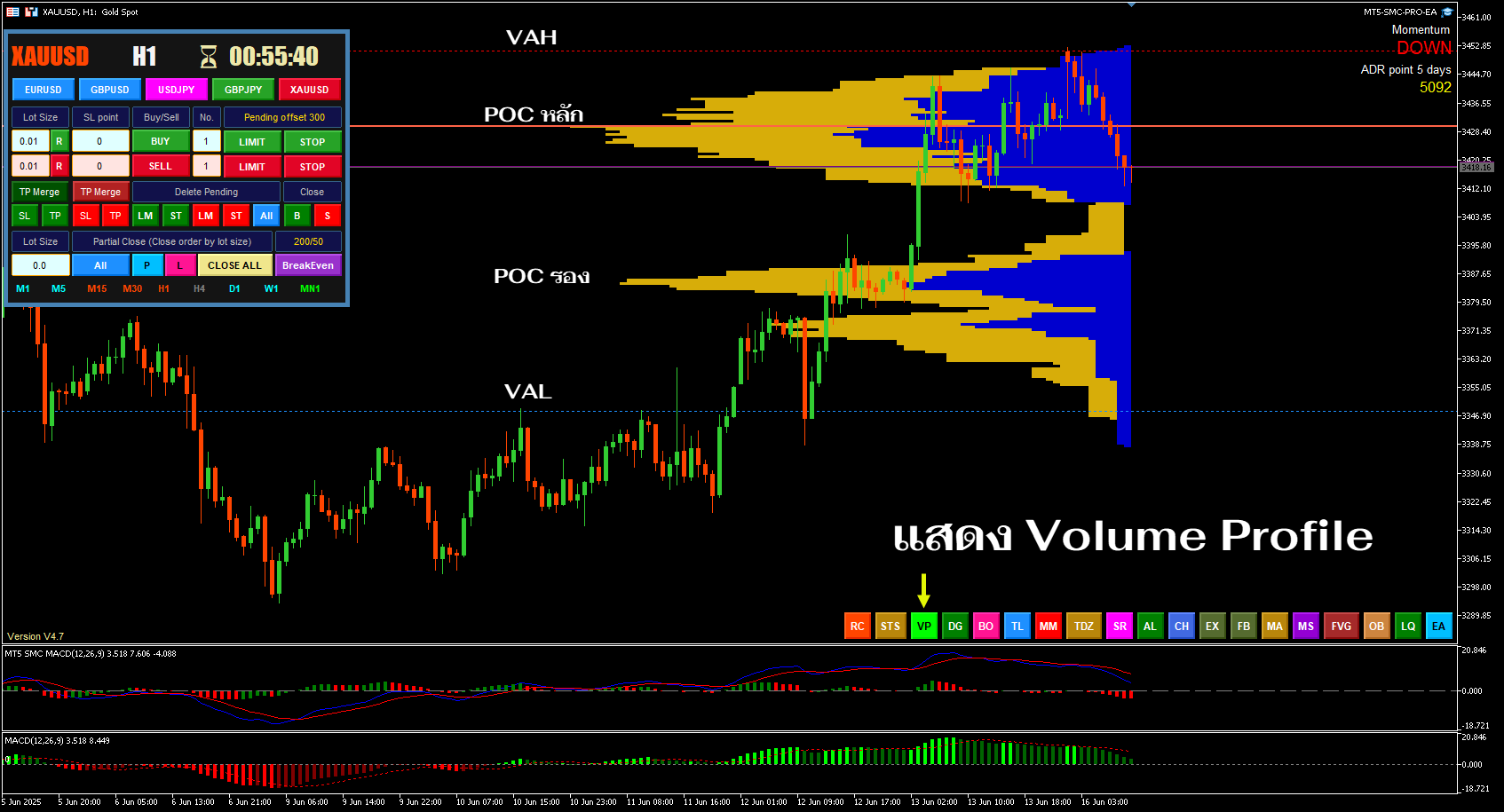 VP หรือ Volume Profile ก็คือเครื่องมือที่แสดงปริมาณการซื้อขาย (Volume) ณ ระดับราคาแต่ละช่วง เพื่อสะท้อนให้เห็นได้ชัดเจนว่าช่วงระดับราคาไหนบ้างที่มีปริมาณการซื้อหรือขายมากที่สุด จุดที่มีการซื้อขายมากที่สุดก็จะเรียกว่า POC (Point Of Control) และ มีระดับที่มีปริมาณการซื้อขาย ในระดับ 70% ของปริมาณซื้อขายที่มากที่สุดก็คือ VAH (Value Area High) และ VAL (Value Area Low) โดย POC ก็จะเหมือนกับแม่เหล็กที่คอยดึงราคาเข้าไปหา หรือ ใช้มองเป็นโซน แนวรับ แนวต้าน ที่แข็งแรงได้เช่นกัน